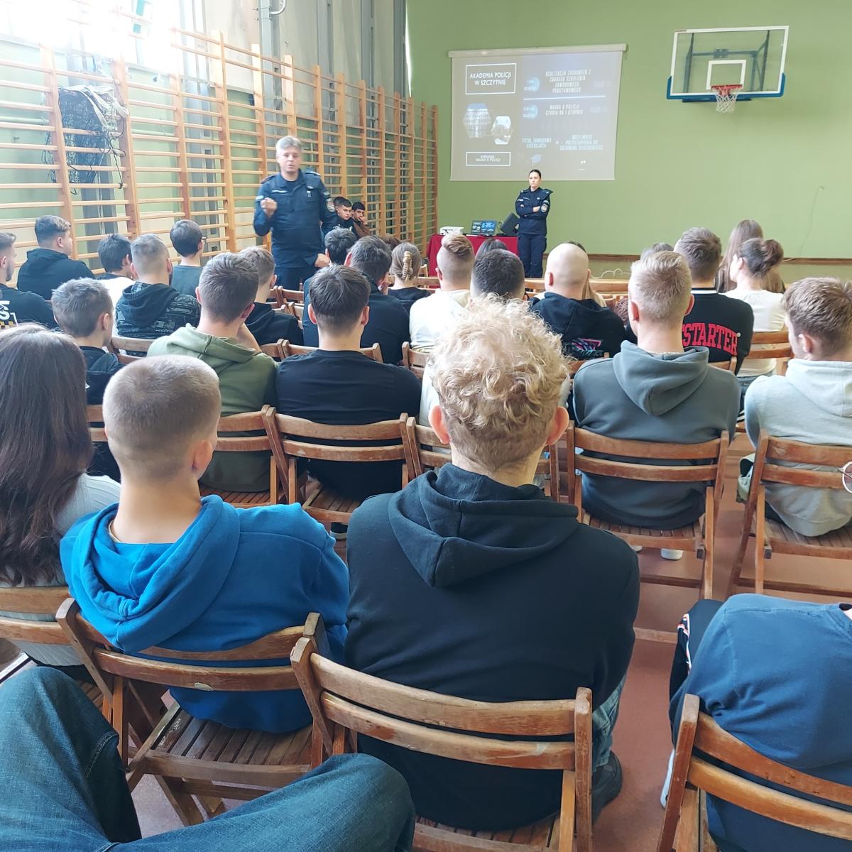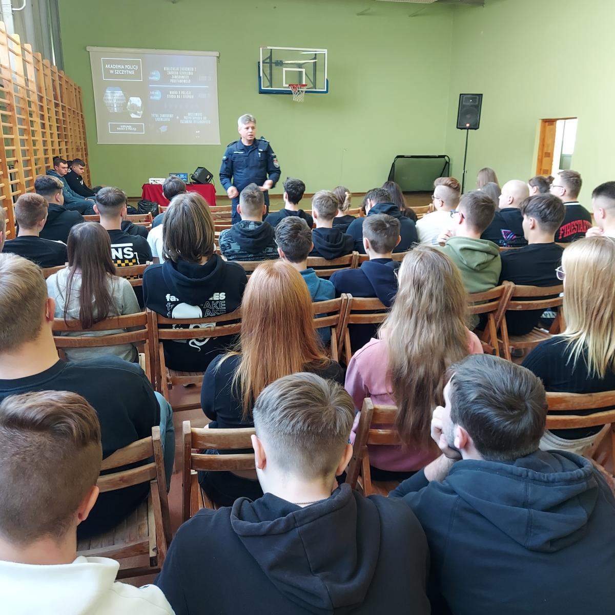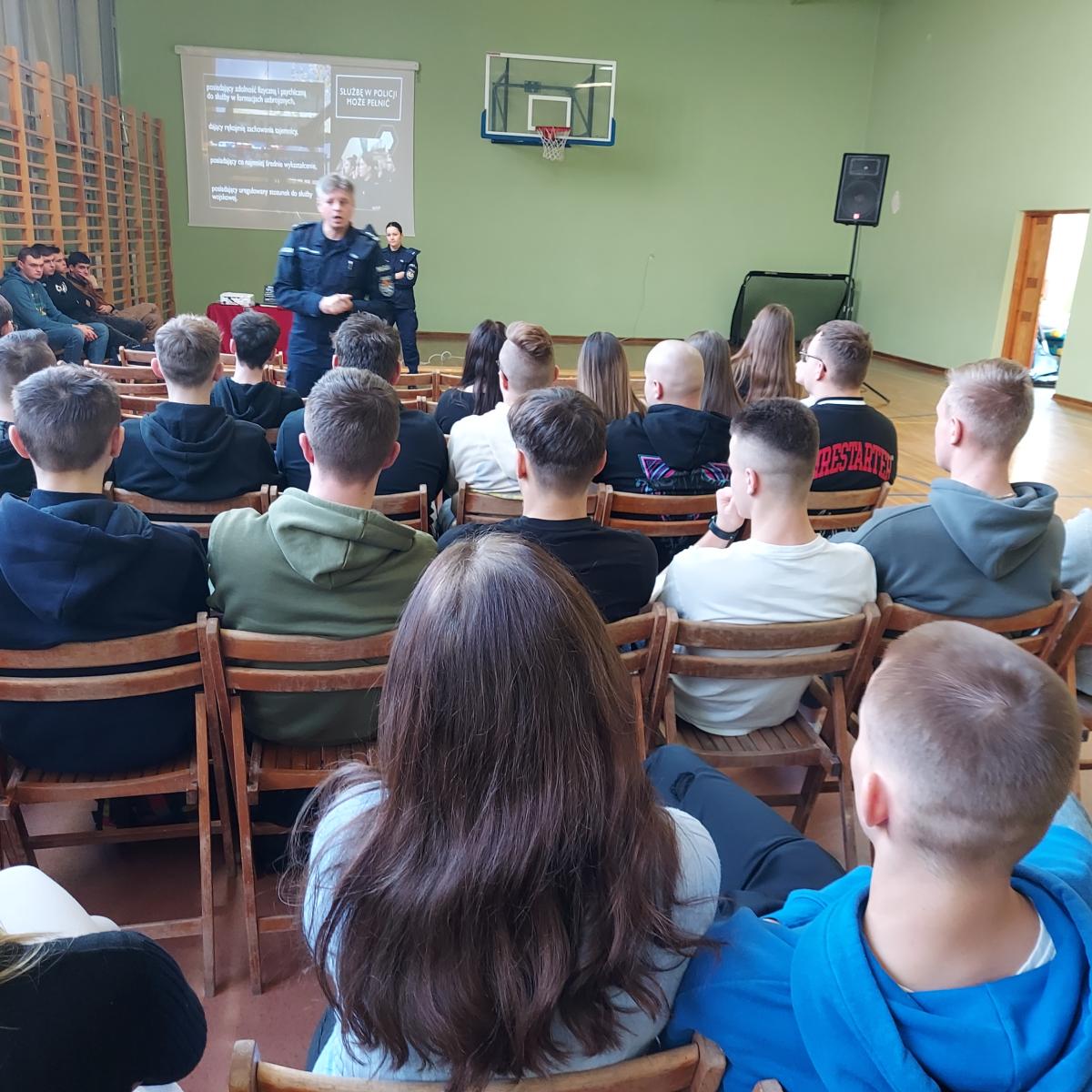 24 listopada 2023r w Powiatowym Zespole Szkół w Błaszkach odbyło się spotkanie uczniów z przedstawicielami Policji. W murach naszej szkoły gościli przedstawiciele Komendy Wojewódzkiej Policji w Łodzi – Naczelnik Wydziału Doboru młodszy inspektor Rafał Mrozowski oraz Komendy Powiatowej Policji w Sieradzu – Rzecznik Prasowy aspirant sztabowy Agnieszka Kulawiecka. Zapraszając w szeregi policji prelegenci zapoznali uczniów ze specyfiką służby w Policji, omówili pracę w różnych wydziałach oraz procedurę naboru do służby w Policji. Dowiedzieliśmy się, jakie warunki należy spełnić, aby wstąpić w szeregi Policji oraz jakie są wymogi formalne w postępowaniu kwalifikacyjnym.