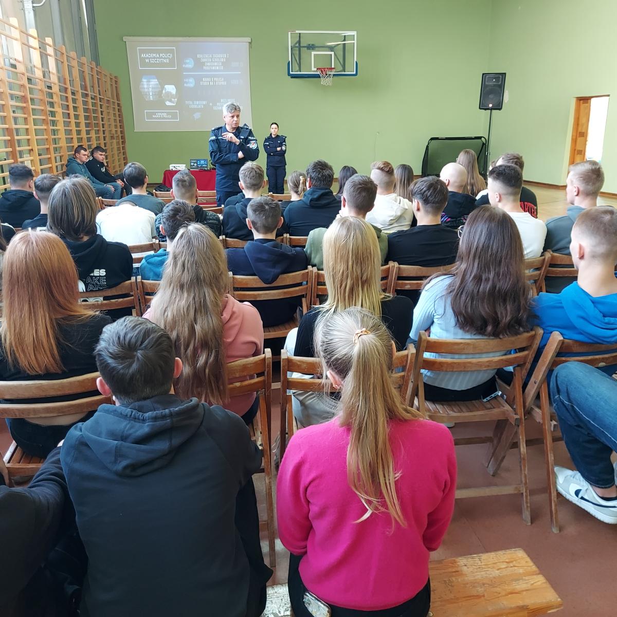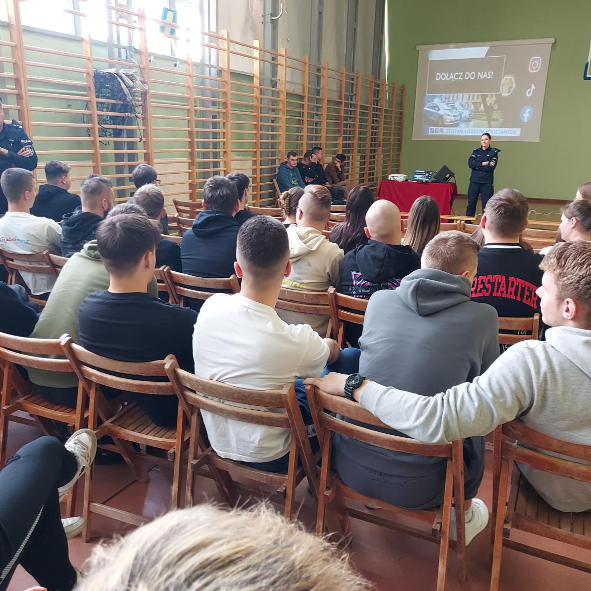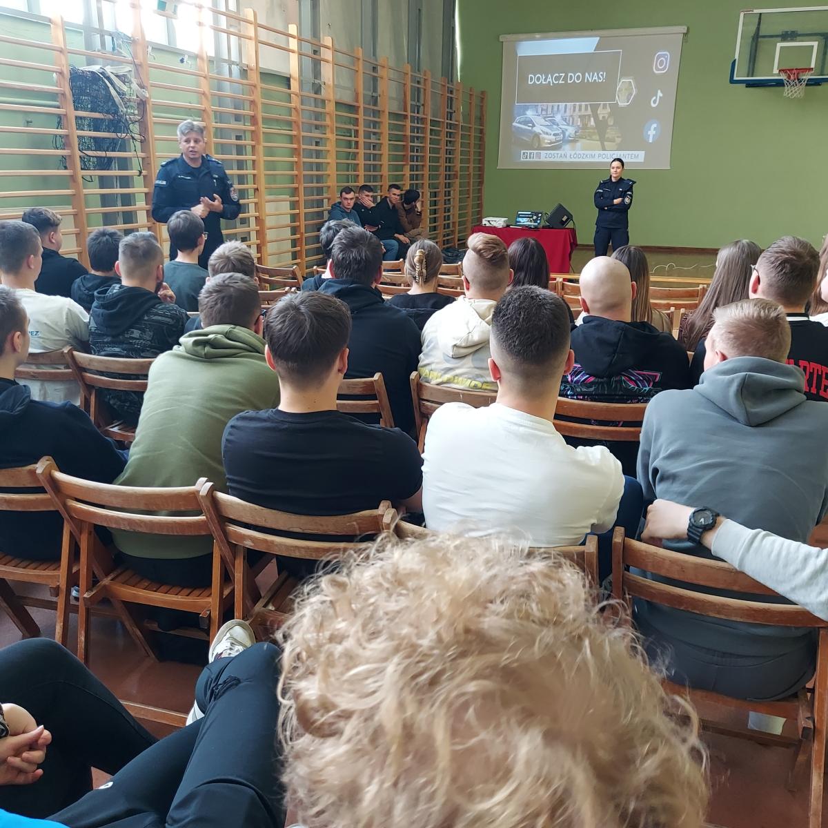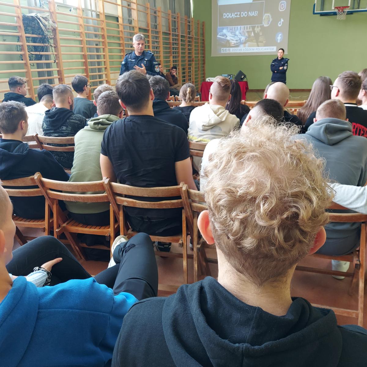 24 listopada 2023r w Powiatowym Zespole Szkół w Błaszkach odbyło się spotkanie uczniów z przedstawicielami Policji. W murach naszej szkoły gościli przedstawiciele Komendy Wojewódzkiej Policji w Łodzi – Naczelnik Wydziału Doboru młodszy inspektor Rafał Mrozowski oraz Komendy Powiatowej Policji w Sieradzu – Rzecznik Prasowy aspirant sztabowy Agnieszka Kulawiecka. Zapraszając w szeregi policji prelegenci zapoznali uczniów ze specyfiką służby w Policji, omówili pracę w różnych wydziałach oraz procedurę naboru do służby w Policji. Dowiedzieliśmy się, jakie warunki należy spełnić, aby wstąpić w szeregi Policji oraz jakie są wymogi formalne w postępowaniu kwalifikacyjnym.