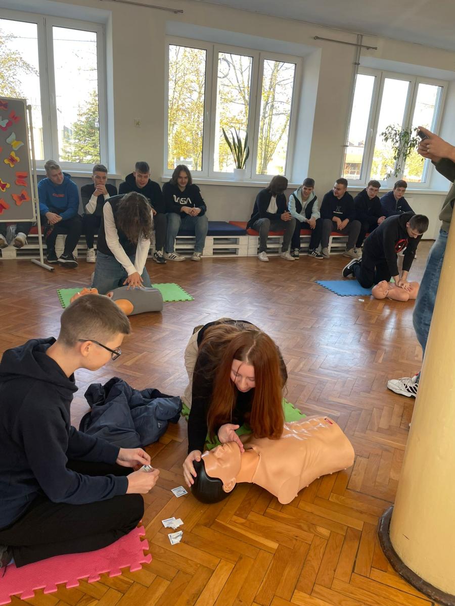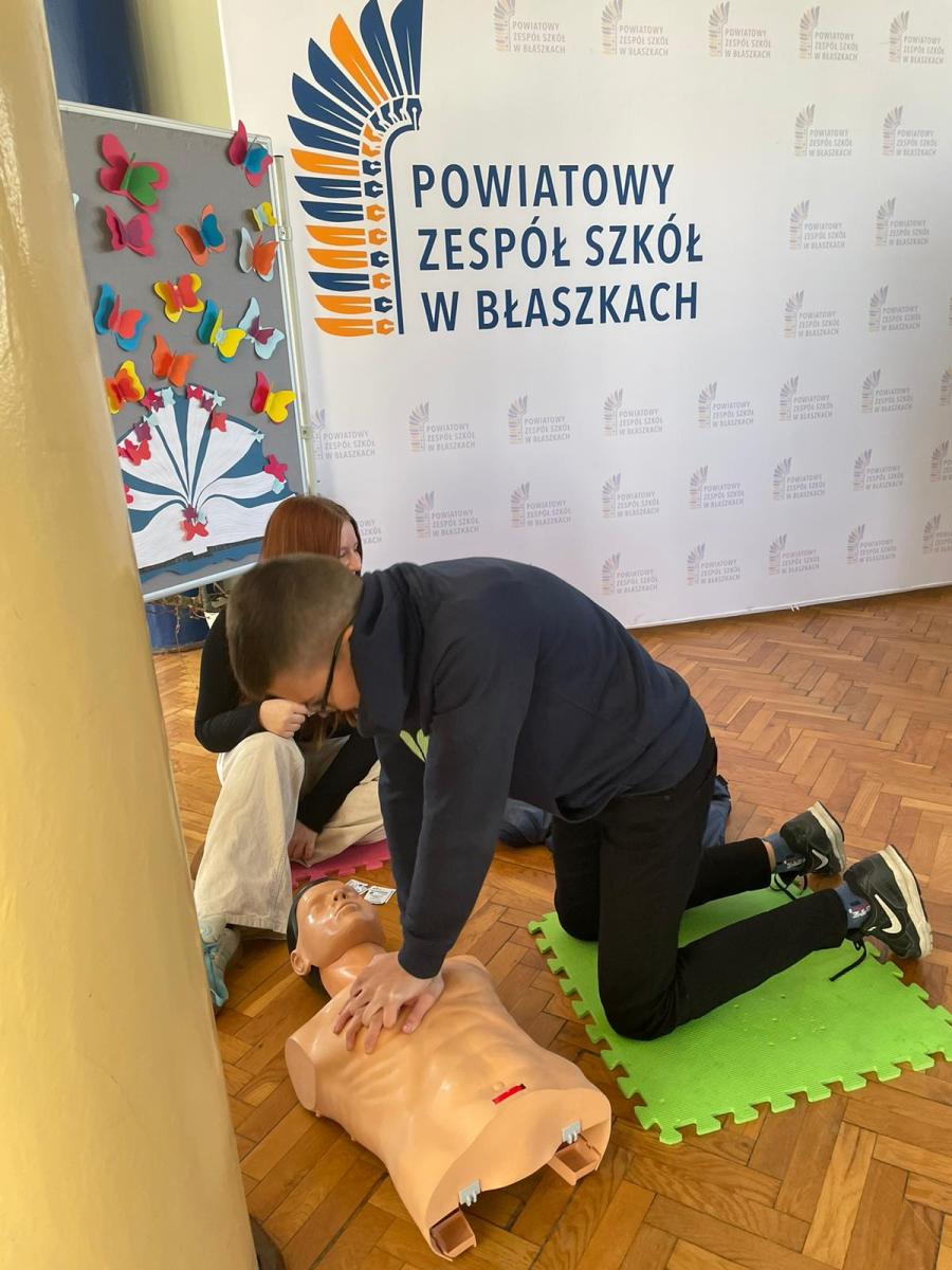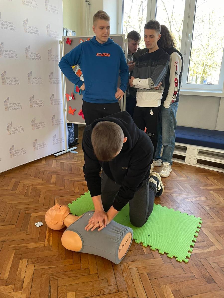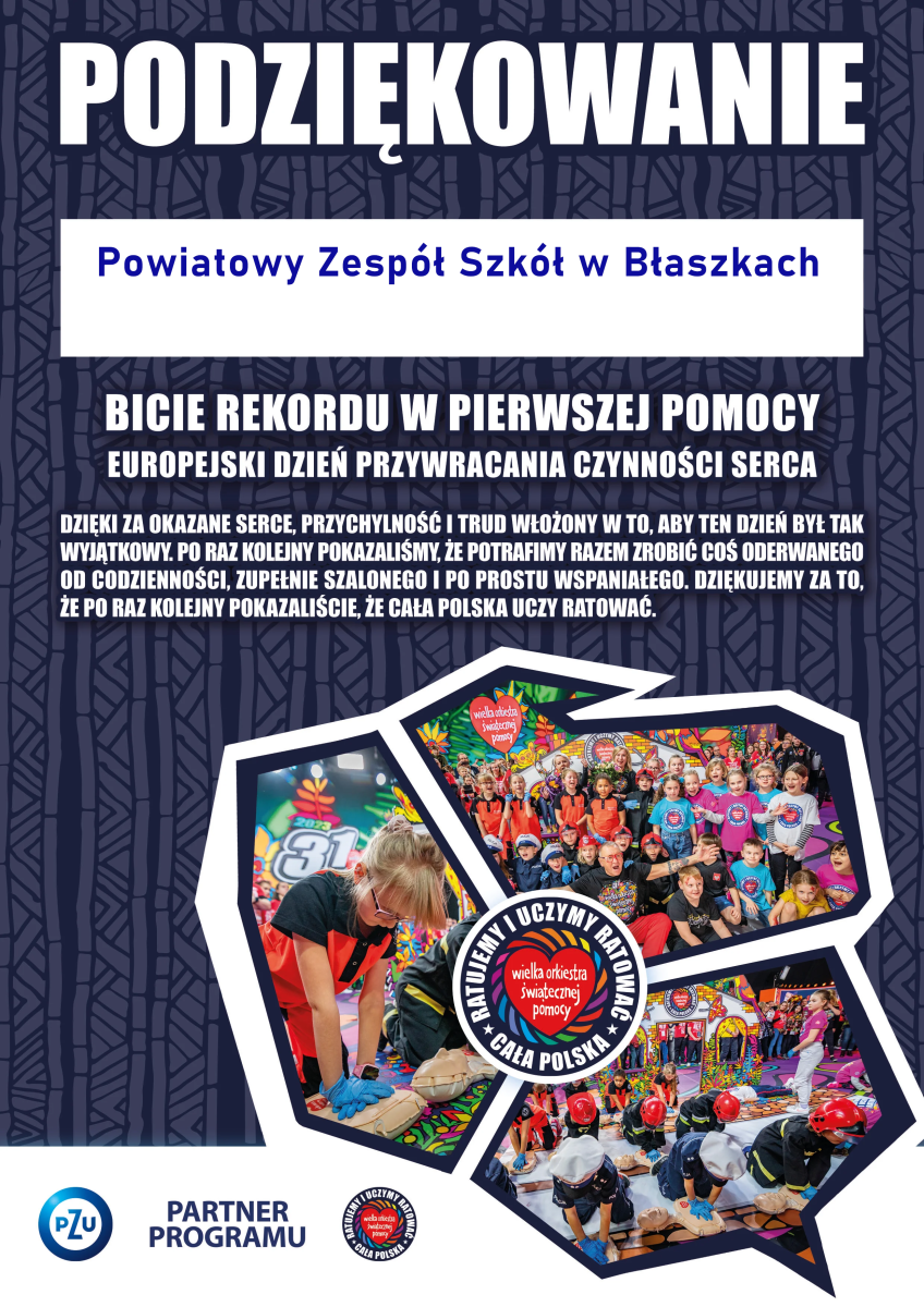 Dnia 16 października chętni uczniowie Powiatowego Zespołu Szkół w Błaszkach wzięli udział w akcji bicia rekordu w udzielaniu pierwszej pomocy, organizowanej przez Wielką Orkiestrę Świątecznej Pomocy. Wydarzenie to odbyło się w ramach Programu Edukacyjnego „Ratujemy i Uczymy Ratować”, który od ponad 18 lat promuje wiedzę na temat pierwszej pomocy, podkreślając, że jej udzielanie jest dziecinnie proste.