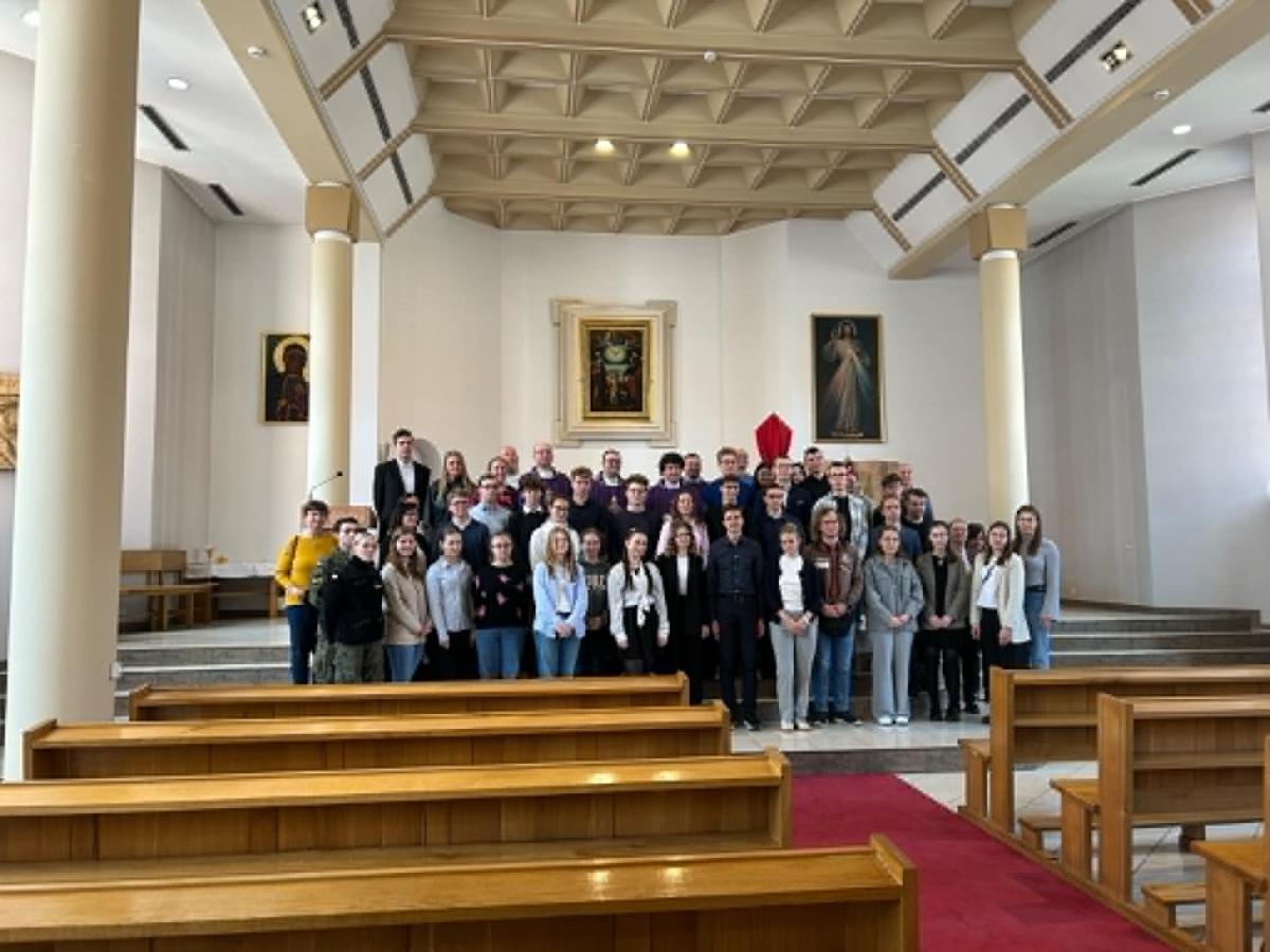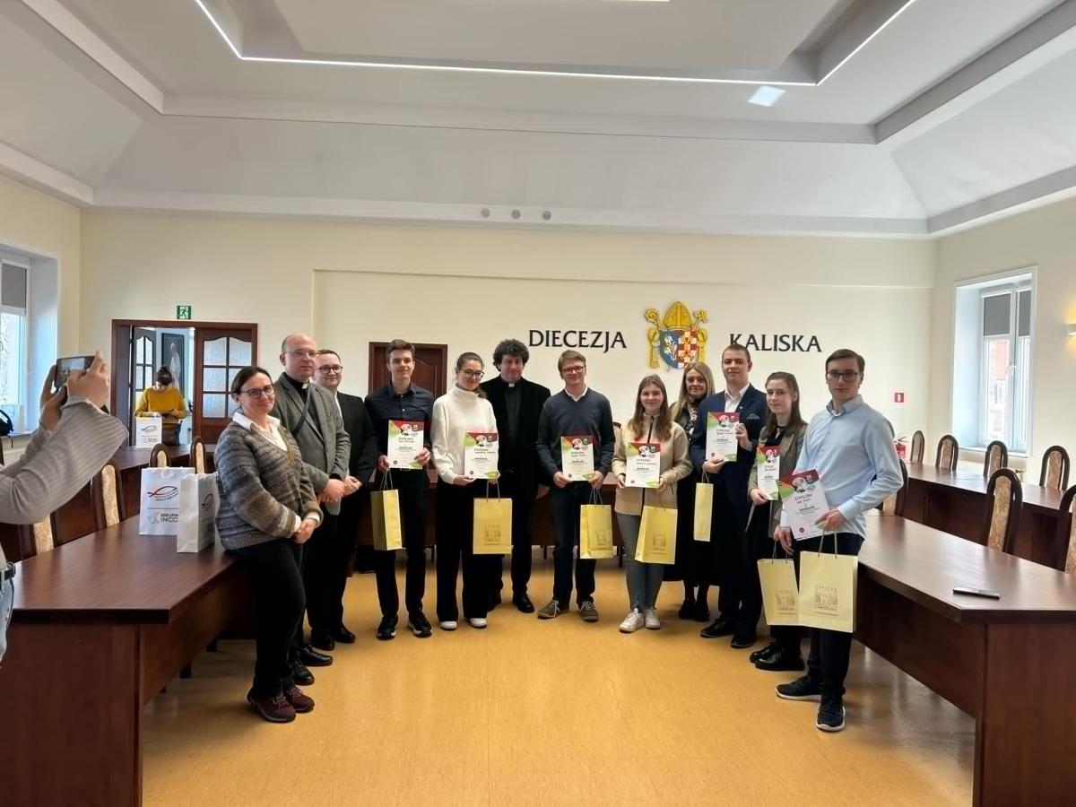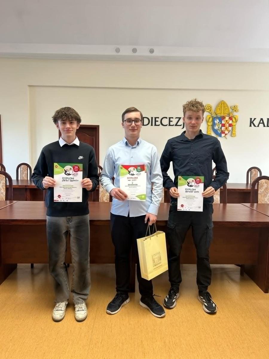 Uczniowie klasy II a – Kacper Badowski, Igor Łojek i Krzysztof Wolarz uczestniczyli w czwartek 10 kwietnia w II etapie Ogólnopolskiego Konkursu Wiedzy Biblijnej w Kaliszu. Licealiści napisali test, następnie wzięli udział w Mszy Świętej w kaplicy Seminarium Duchownego w Kaliszu, gdzie organizowany był konkurs. Z ponad 30 uczestników, komisja konkursowa wyłoniła 7 uczniów, którzy osiągnęli najwyższą punktację i przeszli do etapu ustnego. Wśród nich znalazł się również uczeń naszej szkoły Igor Łojek, który zajął w klasyfikacji końcowej 6 miejsce. Gratulujemy całej naszej trójce dużej wiedzy. Dziękujemy siostrze Alicji Kazimierze Grabowskiej za przygotowanie naszej reprezentacji i gratulujemy tak dobrych wyników!