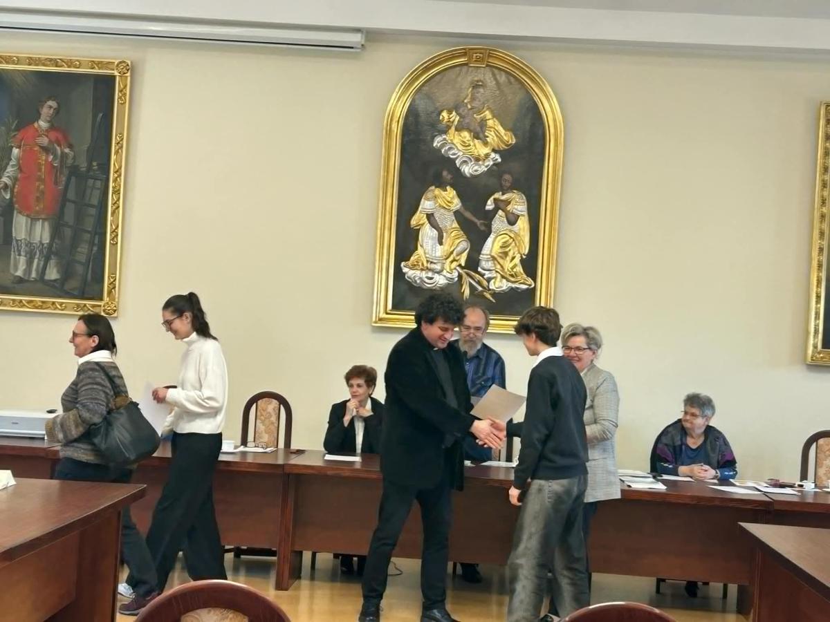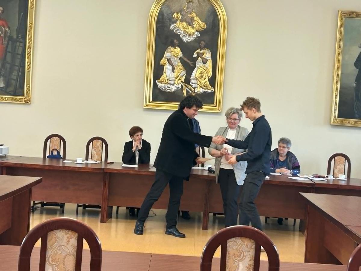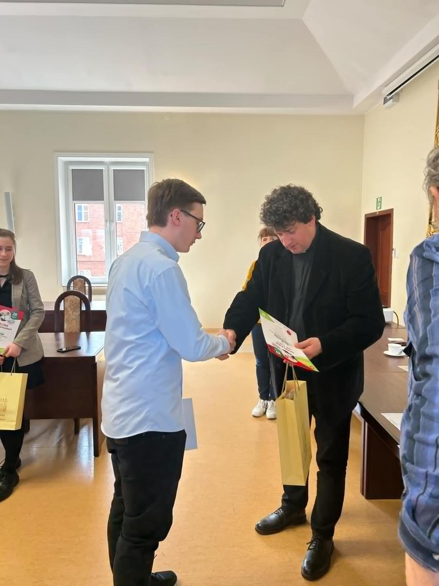 Uczniowie klasy II a – Kacper Badowski, Igor Łojek i Krzysztof Wolarz uczestniczyli w czwartek 10 kwietnia w II etapie Ogólnopolskiego Konkursu Wiedzy Biblijnej w Kaliszu. Licealiści napisali test, następnie wzięli udział w Mszy Świętej w kaplicy Seminarium Duchownego w Kaliszu, gdzie organizowany był konkurs. Z ponad 30 uczestników, komisja konkursowa wyłoniła 7 uczniów, którzy osiągnęli najwyższą punktację i przeszli do etapu ustnego. Wśród nich znalazł się również uczeń naszej szkoły Igor Łojek, który zajął w klasyfikacji końcowej 6 miejsce. Gratulujemy całej naszej trójce dużej wiedzy. Dziękujemy siostrze Alicji Kazimierze Grabowskiej za przygotowanie naszej reprezentacji i gratulujemy tak dobrych wyników!