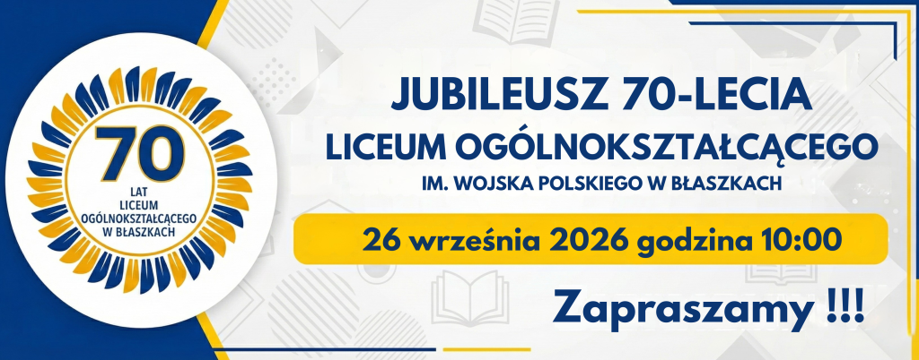Z ogromną radością informujemy, że 26 września 2026 roku będziemy świętować 70-lecie istnienia Liceum Ogólnokształcącego im. Wojska Polskiego w Błaszkach – szkoły, która od pokoleń kształtuje młodych ludzi i buduje lokalną społeczność.